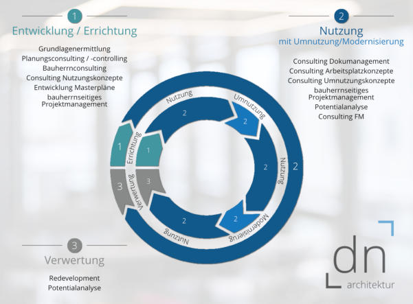 NEUE ARBEITSWELTEN = Unternehmensressourcen (Mitarbeiter) sichernvs.BESTANDSGEBÄUDE = wichtige Ressourcen für die NachhaltigkeitDie Ausnahmesituation der vergangenen Jahre beschleunigt die mittelfristige Entwicklung weg von persönlichen Arbeitsplätzen hin zu einem flexiblen Workplacemanagement.Dabei gewinnt eine effiziente, ressourcenschonende Sanierung der baulichen und technischen Gebäudeinfrastruktur ebenso an Bedeutung, wie eine nachhaltige Optimierung der Gebäudehülle oder die Umnutzung vorhanderer Flächenressourcen.NUTZUNG: DIE LÄNGSTE LEBENSZYKLUSPHASE EINES GEBÄUDES